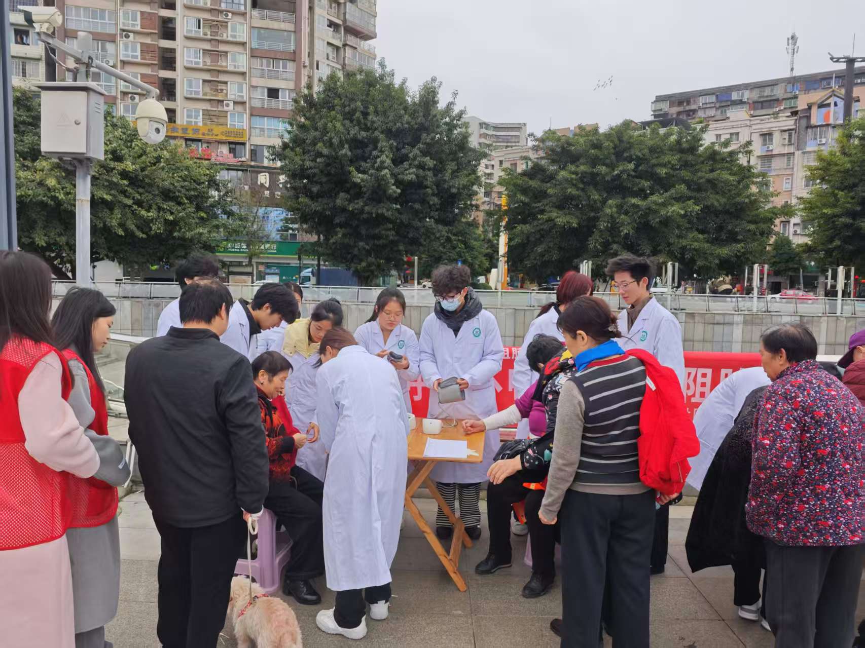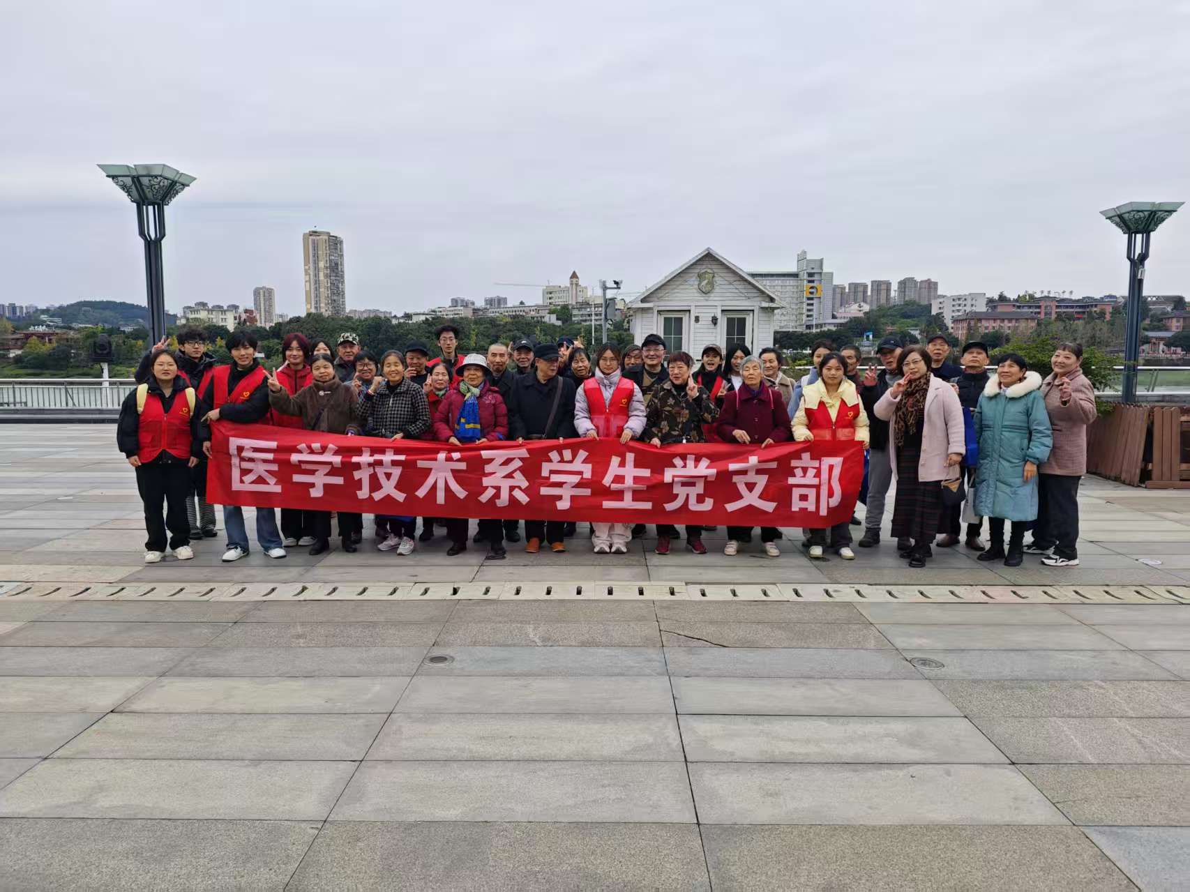 11月18日上午,内江市市中区城西街道为老服务中心联合内江卫生与健康职业学院,在太平洋影院旁成功举办“银龄助老·健康护航·温暖相伴——老年人流感预防与强身健体活动”。医学技术系学生党总支组织10余名学生代表全程参与,40余名辖区老年人在初冬时节收获了满满的健康关怀与温暖陪伴。