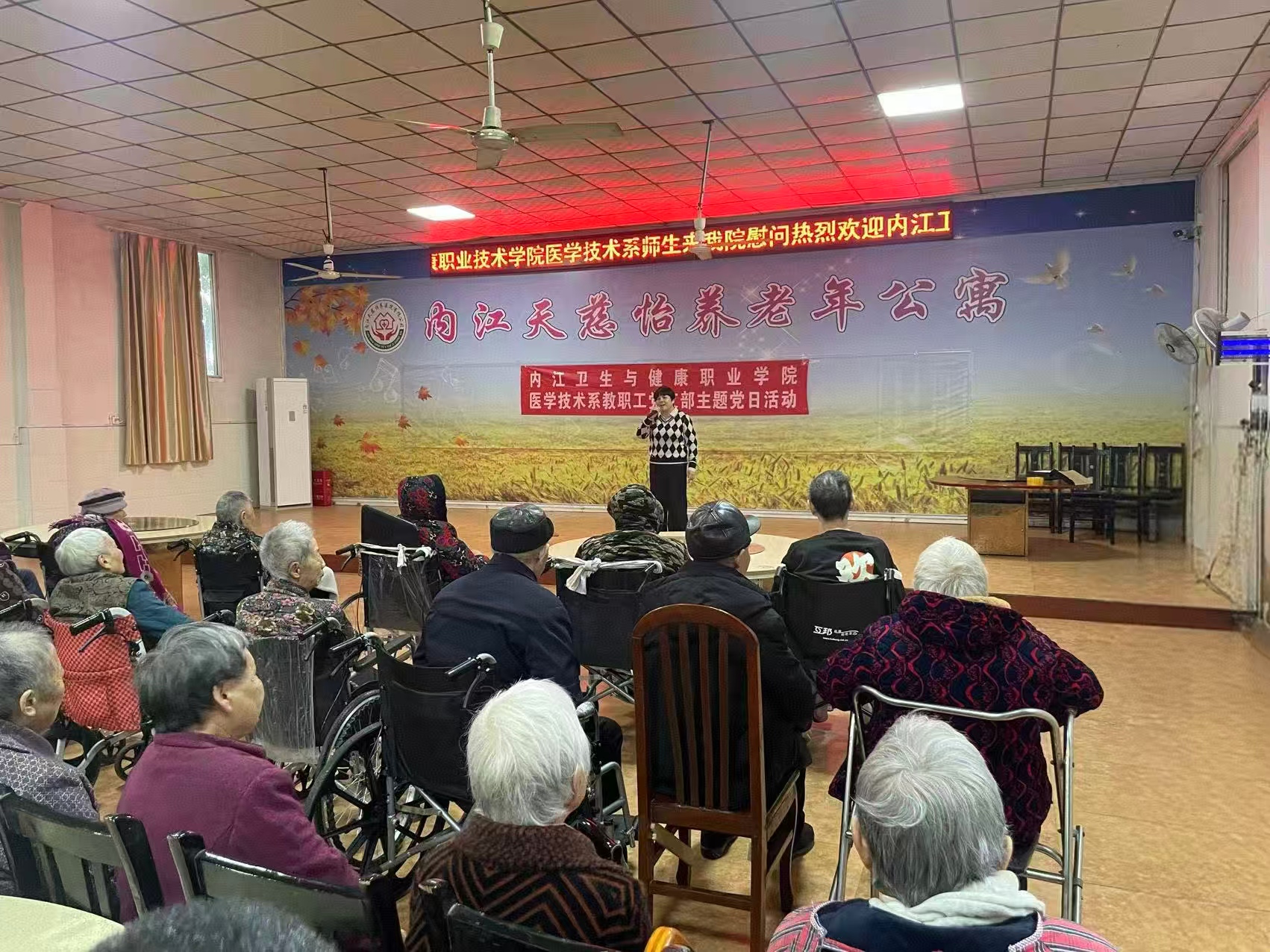 10月29日,医学技术系党总支组织全体党员、入党积极分子和团员代表一起走进内江市东兴区天慈怡养老年公寓,开展“重阳送健康·朝阳暖夕阳”重阳节志愿服务活动,以专业行动践行孝亲敬老美德,为老人们送上满满的节日温暖与关怀。