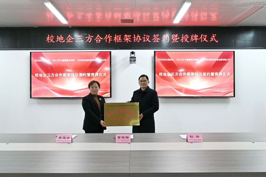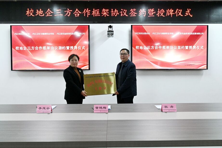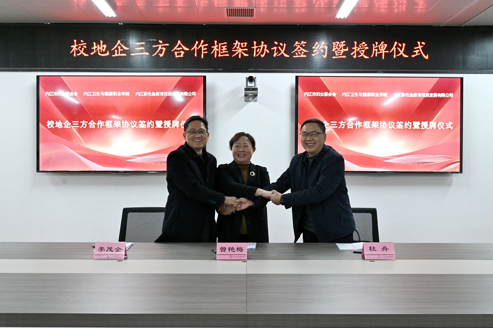 1月7日,内江市妇女联合会、内江卫生与健康职业学院、内江彩色鱼教育投资发展有限公司校地企三方合作框架协议签约暨授牌仪式,在内江卫生与健康职业学院四楼视频会议室圆满举行。内江市妇联党组书记、主席曾艳梅,内江卫生与健康职业学院党委副书记、院长李茂全,内江彩色鱼教育投资发展有限公司党总支书记、董事长杜舟及三方班子成员出席仪式,学院副院长夏蔚主持活动。
