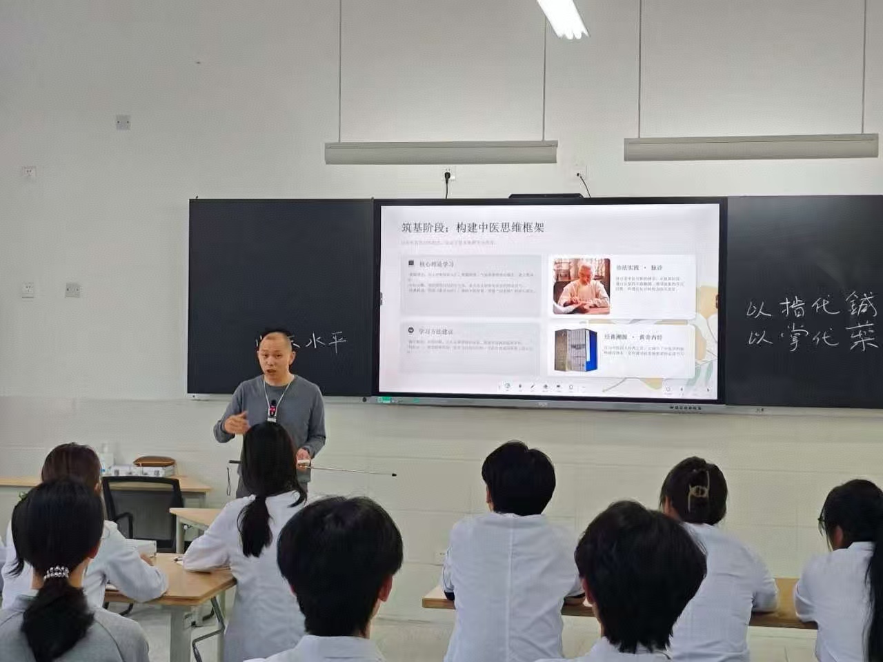 课堂上,钟丹珠立足中医康复技术专业人才培养要求,以钟氏家传八法为核心,结合个人临床经验,系统分享了中医针灸、推拿和康复治疗的学习路径与实践方法,详细讲解钟氏家传竹砭疗法的核心理论与非遗价值,重点介绍竹砭疗法的调理原理、适用范围与技法特点,并结合临床案例,阐释该疗法在颈肩腰腿痛、亚健康调理及中医康养服务中的应用,让同学们直观认识传统中医技艺的实用价值与发展前景。
